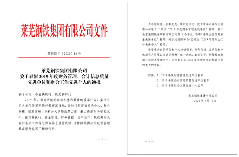 2020年3月16日,萊鋼集團(tuán)下發(fā)“關(guān)于表彰2019年度財(cái)務(wù)管理、會(huì)計(jì)信息質(zhì)量先進(jìn)單位和財(cái)會(huì)工作先進(jìn)個(gè)人的通報(bào)”,山冶設(shè)計(jì)榮獲“2019年度財(cái)務(wù)管理先進(jìn)單位”稱號(hào),創(chuàng)研公司榮獲“2019年度會(huì)計(jì)信息質(zhì)量先進(jìn)單位”稱號(hào),山冶設(shè)計(jì)財(cái)務(wù)部萬同輝、創(chuàng)研公司財(cái)務(wù)部薛云榮獲“2019年度財(cái)會(huì)工作先進(jìn)個(gè)人”稱號(hào)。