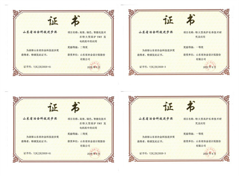 日前,山東省冶金工業(yè)總公司公布2020年度山東省冶金科技進(jìn)步獎獲獎項目,其中我公司申報的《特大型高爐長壽技術(shù)研究及應(yīng)用》、《大型燒結(jié)機節(jié)能環(huán)保綜合技術(shù)研究與應(yīng)用》、《鋼管混凝土格構(gòu)柱+主次桁架屋蓋重型冶金廠房體系研究與應(yīng)用》3個項目榮獲一等獎,《高效、綠色、智能化技術(shù)在特大型高爐TRT 發(fā)電機組中的應(yīng)用》榮獲二等獎。