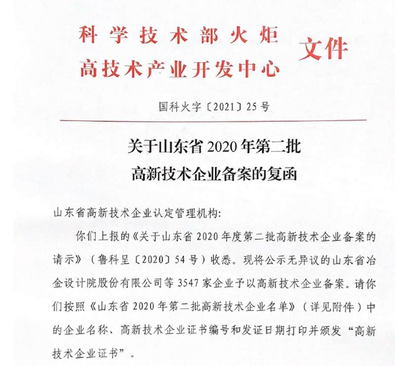 1月15日,根據全國高新技術企業認定管理工作領導小組辦公室印發的《關于山東省2020年第二批高新技術企業備案的復函》,公司順利通過了2020年度國家高新技術企業認定。