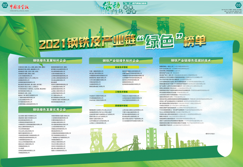 近期中國冶金報(bào)公布了2021年度中國鋼鐵品牌企業(yè)和2021年度鋼鐵及產(chǎn)業(yè)鏈“綠色”標(biāo)桿企業(yè),我公司雙雙上榜。5月10日,第5個(gè)中國品牌日,公布了2021中國鋼鐵品牌榜單,公司再次榮獲中國鋼鐵工程技術(shù)類“優(yōu)秀品牌供應(yīng)商”榮譽(yù)稱號,我公司已經(jīng)連續(xù)兩年獲得中國鋼鐵工程技術(shù)類優(yōu)秀品牌企業(yè)。6月5日,世界環(huán)境日,公布了2021鋼鐵及產(chǎn)業(yè)鏈“綠色”榜單,公司榮獲中國“鋼鐵產(chǎn)業(yè)鏈綠色標(biāo)桿企業(yè)”稱號。