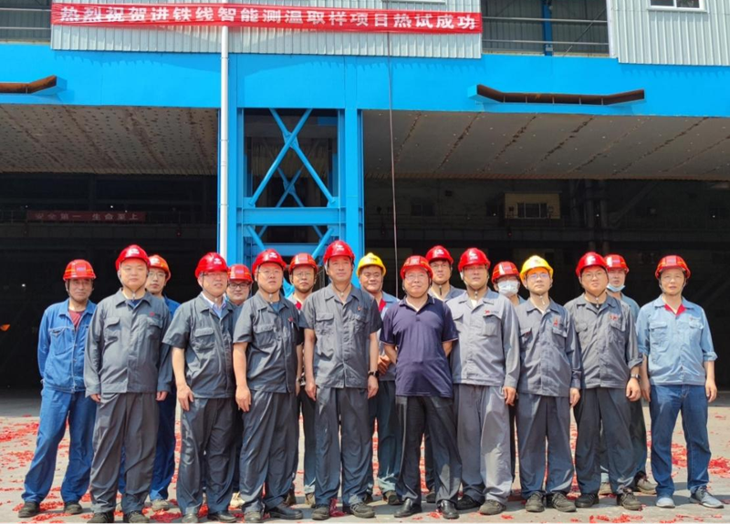 7月1日,在慶祝黨的101周年生日之際,黃海之濱,喜傳捷報(bào),我公司EPC總承包的山鋼日照精品基地鐵水智能快速測(cè)溫取樣項(xiàng)目成功熱試!當(dāng)天下午,橫跨煉鋼廠進(jìn)鐵線上方的智能測(cè)溫取樣平臺(tái)上,三套智能機(jī)器人經(jīng)過(guò)前期精心調(diào)教已進(jìn)入最佳狀態(tài),胸有成竹地靜坐在軌道上等待著主人的到來(lái),13時(shí)30分,日照精品基地?zé)掍搹S王經(jīng)理一行來(lái)到平臺(tái),詳細(xì)了解設(shè)備安裝、調(diào)試、生產(chǎn)準(zhǔn)備情況,煉鋼廠黨政領(lǐng)導(dǎo)對(duì)該項(xiàng)目從設(shè)計(jì)、現(xiàn)場(chǎng)施工、設(shè)備供貨直到智能調(diào)試,給予高度評(píng)價(jià),對(duì)總包方的出色表現(xiàn)予以充分肯定,并向我公司送交了表?yè)P(yáng)信。王經(jīng)理一聲令下,銀裝素裹的機(jī)器人起步行走,準(zhǔn)確來(lái)到取樣窗口,熟練地展開(kāi)鋼鐵長(zhǎng)臂,下探、取樣、回臂、卸樣、丟桿、復(fù)位,現(xiàn)場(chǎng)響起熱烈的掌聲,熱試成功!然后現(xiàn)場(chǎng)舉行了熱烈的慶祝儀式,煉鋼廠黨政領(lǐng)導(dǎo)與參戰(zhàn)各方合影留念。